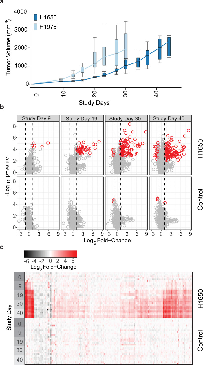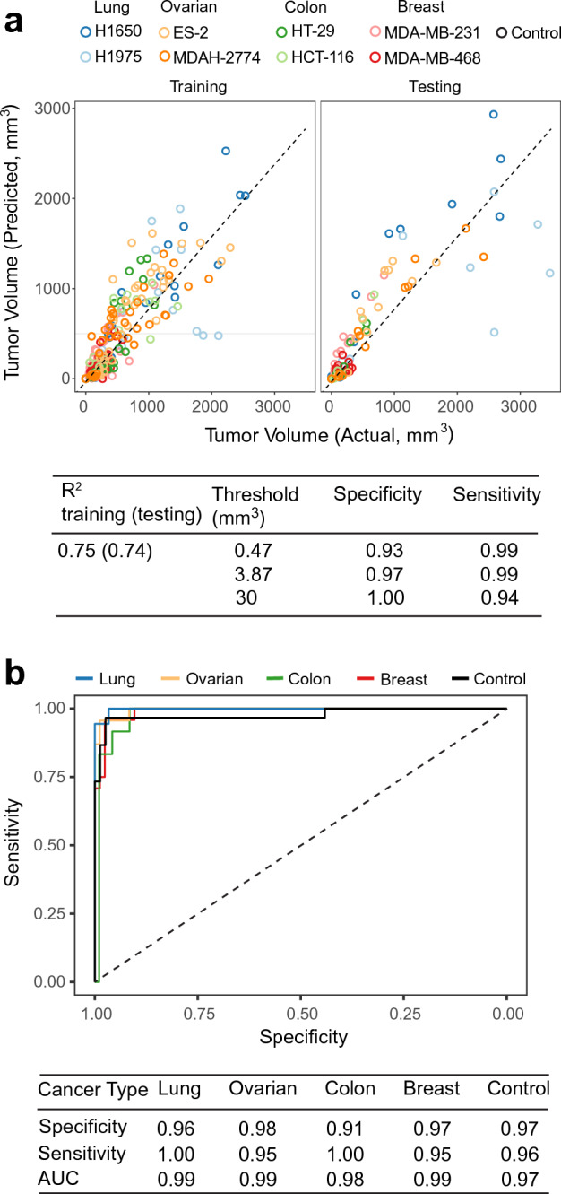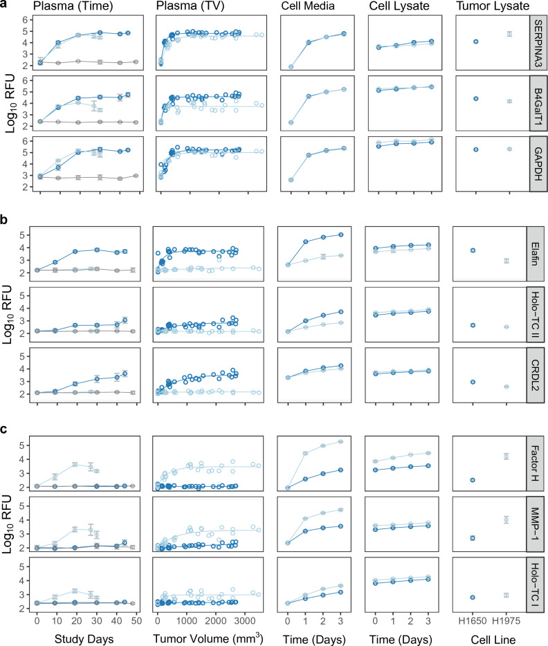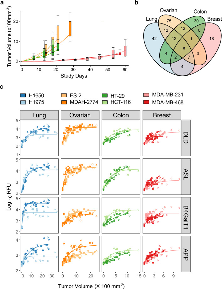 Early detection of cancer is vital for the best chance of successful treatment, but half of all cancers are diagnosed at an advanced stage. A simple and reliable blood screening test applied routinely would therefore address a major unmet medical need. To gain insight into the value of protein biomarkers in early detection and stratification of cancer we determined the time course of changes in the plasma proteome of mice carrying transplanted human lung, breast, colon, or ovarian tumors. For protein measurements we used an aptamer-based assay which simultaneously measures ~ 5000 proteins. Along with tumor lineage-specific biomarkers, we also found 15 markers shared among all cancer types that included the energy metabolism enzymes glyceraldehyde-3-phosphate dehydrogenase, glucose-6-phophate isomerase and dihydrolipoyl dehydrogenase as well as several important biomarkers for maintaining protein, lipid, nucleotide, or carbohydrate balance such as tryptophanyl t-RNA synthetase and nucleoside diphosphate kinase. Using significantly altered proteins in the tumor bearing mice, we developed models to stratify tumor types and to estimate the minimum detectable tumor volume. Finally, we identified significantly enriched common and unique biological pathways among the eight tumor cell lines tested.