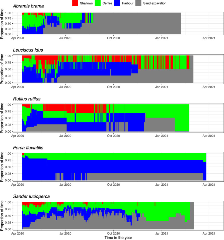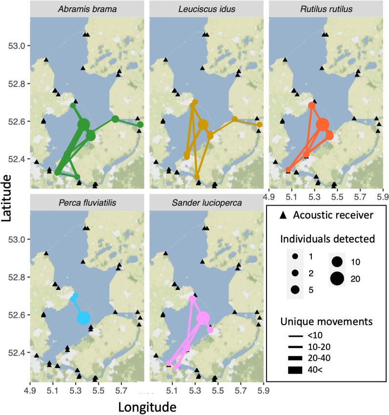 Results: Adult omnivorous Cyprinidae and piscivorous Percidae arrived at the archipelago in early spring, corresponding with expected spawning movements. During the productive summer season, 12 species of young-of-the-year fish appeared along the sheltered shorelines, with particularly high densities of common roach (Rutilus rutilus) and European perch (Perca fluviatilis). This suggests the sheltered, shallow, vegetated waters formed new suitable spawning and recruitment habitat for the fish community. Despite highest food densities for adult fish in the shallowest habitats (< 2-m), adult fish preferred minimally 2-m deep water. After spawning most Cyprinidae left the archipelago and moved long distances through the lake system, while most Percidae remained resident. This may be related to (1) high densities of young-of-the-year fish as food for piscivores, (2) medium food densities for omnivores compared to elsewhere in the lake-system, or (3) the attractiveness of 30-m deep sand excavations that were newly created and frequently used by one-third of all tracked fish.