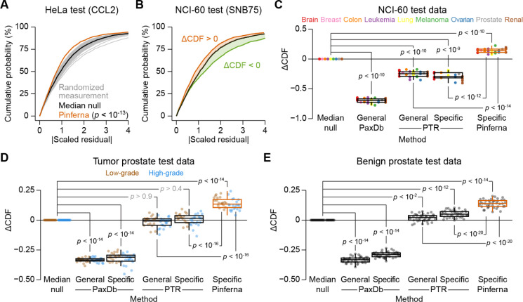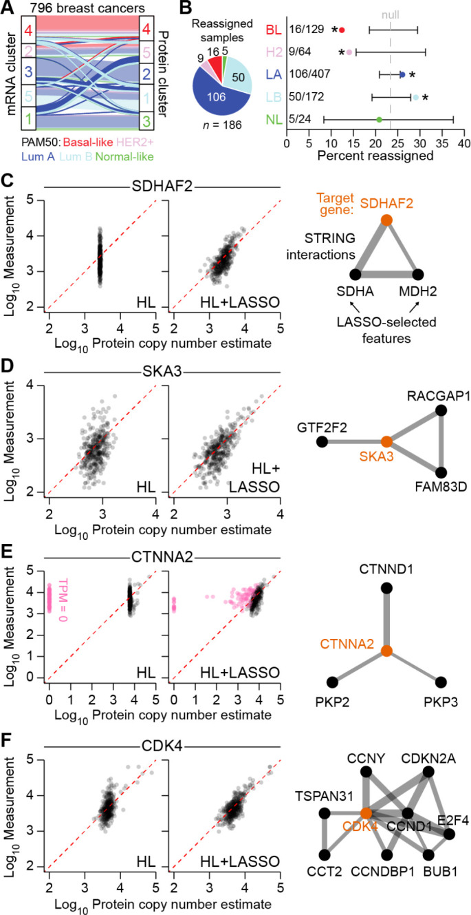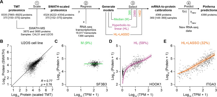Protein copy numbers constrain systems-level properties of regulatory networks, but absolute proteomic data remain scarce compared to transcriptomics obtained by RNA sequencing. We addressed this persistent gap by relating mRNA to protein statistically using best-available data from quantitative proteomics-transcriptomics for 4366 genes in 369 cell lines. The approach starts with a central estimate of protein copy number and hierarchically appends mRNA-protein and mRNA-mRNA dependencies to define an optimal gene-specific model that links mRNAs to protein. For dozens of independent cell lines and primary prostate samples, these protein inferences from mRNA outmatch stringent null models, a count-based protein-abundance repository, and empirical protein-to-mRNA ratios. The optimal mRNA-to-protein relationships capture biological processes along with hundreds of known protein-protein interaction complexes, suggesting mechanistic relationships are embedded. We use the method to estimate viral-receptor abundances of CD55-CXADR from human heart transcriptomes and build 1489 systems-biology models of coxsackievirus B3 infection susceptibility. When applied to 796 RNA sequencing profiles of breast cancer from The Cancer Genome Atlas, inferred copy-number estimates collectively reclassify 26% of Luminal A and 29% of Luminal B tumors. Protein-based reassignments strongly involve a pharmacologic target for luminal breast cancer (CDK4) and an α-catenin that is often undetectable at the mRNA level (CTTNA2). Thus, by adopting a gene-centered perspective of mRNA-protein covariation across different biological contexts, we achieve accuracies comparable to the technical reproducibility limits of contemporary proteomics. The collection of gene-specific models is assembled as a web tool for users seeking mRNA-guided predictions of absolute protein abundance (http://janeslab.shinyapps.io/Pinferna).