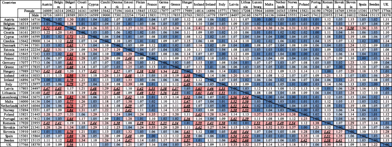 Methods: DALY rate ratios were calculated to determine and compare inequalities between the 30 EEA countries, by sex, and across time. Annual rate of change was used to determine the differences in DALY rate between 1990 and 2019 for males and females. The Gini Coefficient (GC) was used to measure the DALY rate inequalities across countries, and the Slope Index of Inequality (SII) to estimate the average absolute difference in DALY rate across countries.