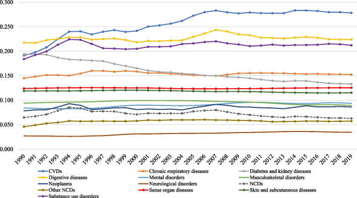 Results: Between 1990 and 2019, there was an overall declining trend in DALY rate, with larger declines among females compared to males. Among EEA countries, in 2019 the highest NCD DALY rate for both sexes were observed for Bulgaria. For the whole period, the highest DALY rate ratios were identified for digestive diseases, diabetes and kidney diseases, substance use disorders, cardiovascular diseases (CVD), and chronic respiratory diseases - representing the highest inequality between countries. In 2019, the highest DALY rate ratio was found between Bulgaria and Iceland for males. GC and SII indicated that the highest inequalities were due to CVD for most of the study period - however, overall levels of inequality were low.