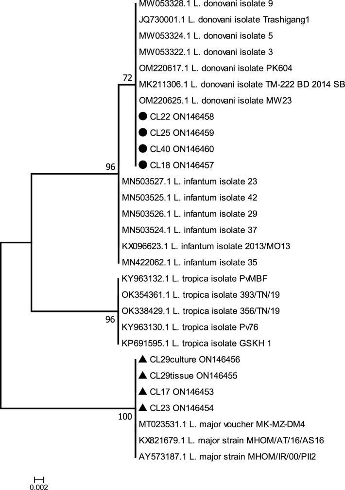 Cutaneous leishmaniasis cases have increased dramatically in recent years in Nepal. The study offers molecular identification of the Leishmania species using 40 patient's aspiration biopsy samples, targeting markers kinetoplast minicircle DNA (kDNA) and internal transcribed spacer-1 (ITS1). Among molecularly diagnosed 22 cutaneous leishmaniasis cases, L. donovani complex was identified in 13 instances and L. major in 9 cases. The ITS1 PCR was positive in 12 of the positive nested- kDNA PCR cases (12/22), confirming L. donovani complex in seven of the cases and L. major in five of the cases. In addition, the study conclude that concurrent occurrence of atypical cutaneous infections caused by L. donovani parasite in 59.1% of cases and typical cutaneous infections caused by L. major parasite in 40.9% of cases. A Phylogentic analaysis showed that the detected L. donovani species present null genetic distances from seven references of L. donovani, but slight differences between ITS1 sequences and not grouped into a significant monophyletic cluster.