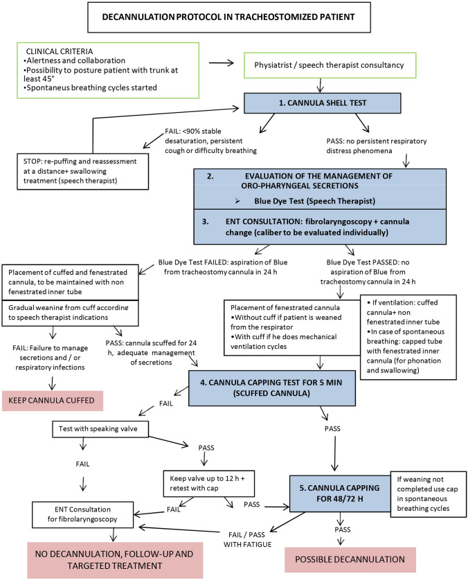 As a Covid Hub in Emilia Romagna, we have experienced an increasing number of tracheostomized patients, prompting us to develop a standardized decannulation protocol for COVID-19 ARDS patients. Currently, there are no guidelines or protocols for decannulation in this population, and few studies have investigated the early outcomes of tracheostomy in COVID-19 patients, with no detailed analysis of the decannulation process. We recognized the importance of mutual reliance among our team members and the significant achievements we made compared to previous decannulation methods. Through the optimization of the decannulation process, we identified a clear, safe, and repeatable method based on clinical best practice and literature evidence. We decided to implement an existing standardized decannulation protocol, which was originally designed for severe brain-damaged patients, due to the growing number of COVID-19 patients with tracheostomy. This protocol was designed for daily practice and aimed to provide a uniform approach to using devices like fenestrated cannulas, speaking valves, and capping. The results of our implementation include:expanding the applicability of the protocol beyond severe brain-damaged patients to different populations and settings (in this case, patients subjected to a long period of sedation and invasive ventilation)early activation of speech therapy to facilitate weaning from the cannula and recovery of physiological swallowing and phonationearly activation of otolaryngologist evaluation to identify organic problems related to prolonged intubation, tracheostomy, and ventilation and address proper speech therapy treatmentactivation of more fluid and effective management paths for decannulation with a multiprofessional team.