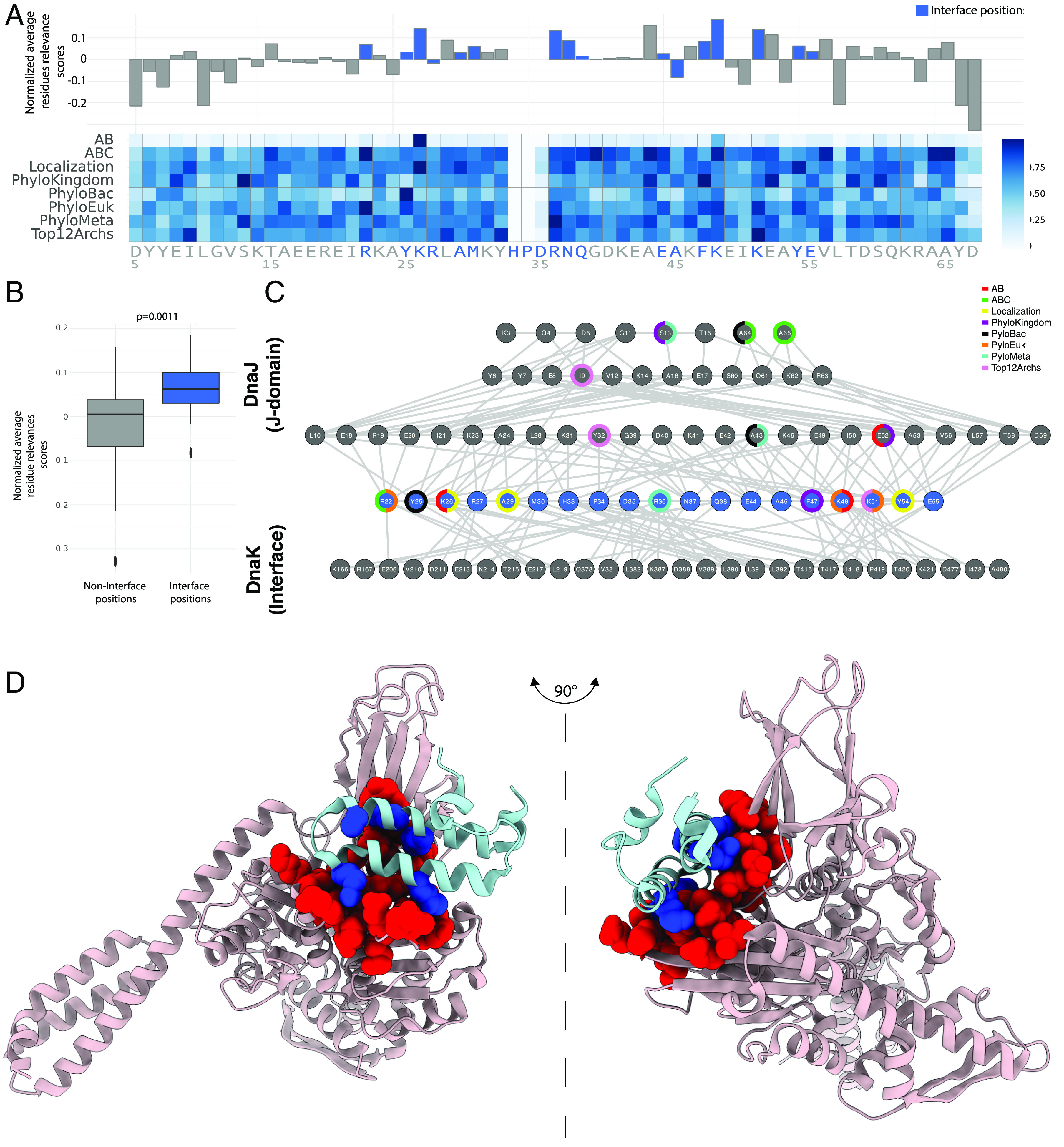 The 70-kD heat shock protein (Hsp70) chaperone system is a central hub of the proteostasis network that helps maintain protein homeostasis in all organisms. The recruitment of Hsp70 to perform different and specific cellular functions is regulated by the J-domain protein (JDP) co-chaperone family carrying the small namesake J-domain, required to interact and drive the ATPase cycle of Hsp70s. Besides the J-domain, prokaryotic and eukaryotic JDPs display a staggering diversity in domain architecture, function, and cellular localization. Very little is known about the overall JDP family, despite their essential role in cellular proteostasis, development, and its link to a broad range of human diseases. In this work, we leverage the exponentially increasing number of JDP gene sequences identified across all kingdoms owing to the advancements in sequencing technology and provide a broad overview of the JDP repertoire. Using an automated classification scheme based on artificial neural networks (ANNs), we demonstrate that the sequences of J-domains carry sufficient discriminatory information to reliably recover the phylogeny, localization, and domain composition of the corresponding full-length JDP. By harnessing the interpretability of the ANNs, we find that many of the discriminatory sequence positions match residues that form the interaction interface between the J-domain and Hsp70. This reveals that key residues within the J-domains have coevolved with their obligatory Hsp70 partners to build chaperone circuits for specific functions in cells.