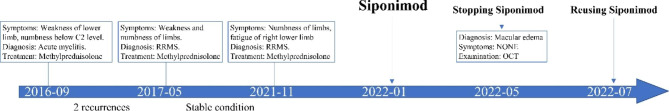 Case presentation: A 38-year-old Chinese female patient with secondary progressive multiple sclerosis, who had recurrent numbness of the limbs and right leg fatigue, developed mild macular edema following 4 months of siponimod treatment. The macular edema resolved after discontinuing the medication, and did not recur after resuming siponimod.