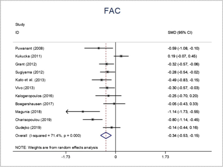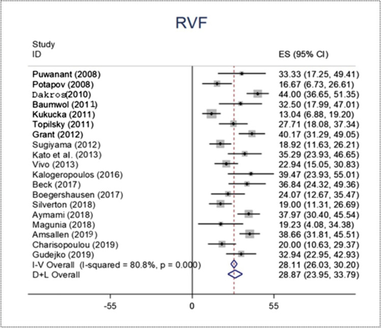Results: A total number of 19 observational human studies published between 2008 and 2019 were included. We identified 524 RVF patients out of a pooled final population of 1741 patients. The RVF overall proportion was 28.25% with 95% confidence interval (CI) 0.24-0.34. The highest variability of perioperative echocardiographic parameters between the RVF and no right ventricular failure (NO-RVF) groups has been found with tricuspid annular plane systolic excursion (TAPSE), fractional area change (FAC), and right ventricular global longitudinal strain (RVGLS). Their standardized mean deviation (SMD) was - 0.33 (95% CI - 0.54 to - 0.11; p value 0.003), - 0.34 (95% CI - 0.53 to - 0.15; p value 0.0001), and 0.52 (95% CI 0.79 to 0.25; p value 0.0001), respectively.