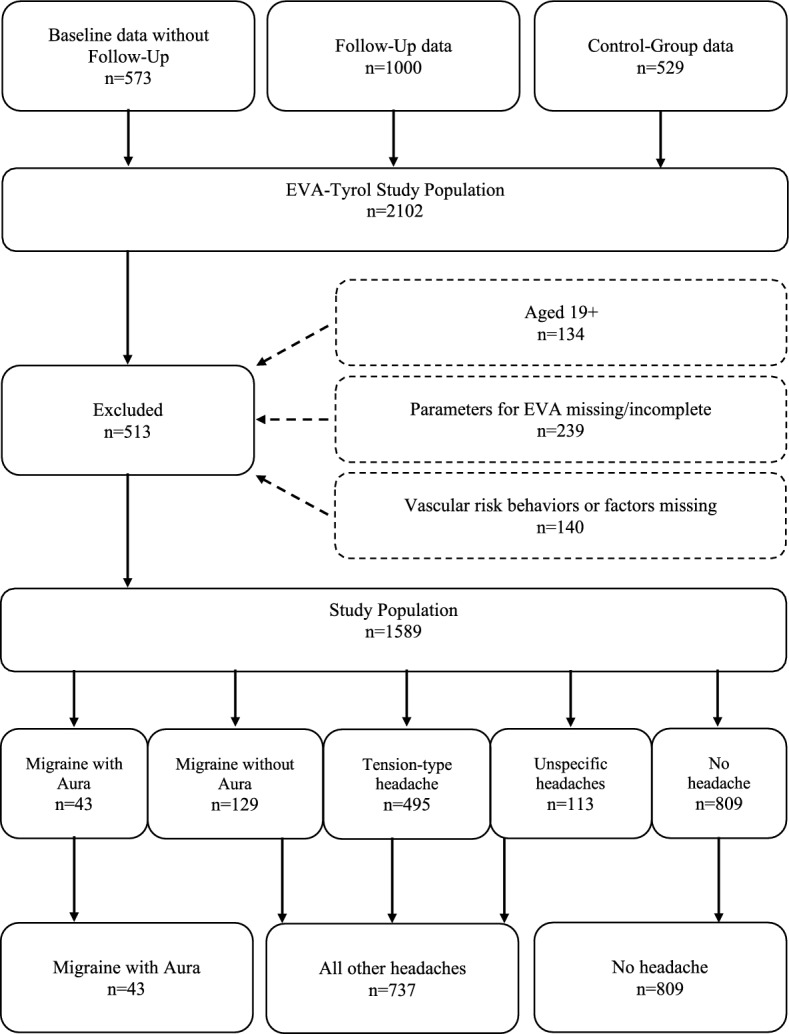 Methods: In the Early Vascular Ageing Tyrol study, a community-based non-randomized controlled trial conducted in 45 schools and companies in Tyrol (Austria) and South-Tyrol (Italy) between May 2015 and September 2018 aiming to increase cardiovascular health in adolescents, headache syndromes were classified according to the International Classification of Headache Disorders in a face-to-face interview. Carotid-femoral pulse-wave-velocity was measured by applanation tonometry and carotid intima-media-thickness by high-resolution ultrasound of the distal common carotid arteries. Differences in pulse-wave-velocity and carotid intima-media-thickness in youngsters with migraine with aura were compared respectively to those without headache and with other headaches by multivariable linear regression analysis.