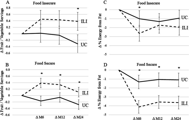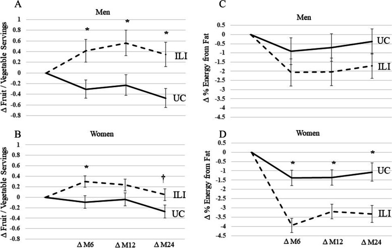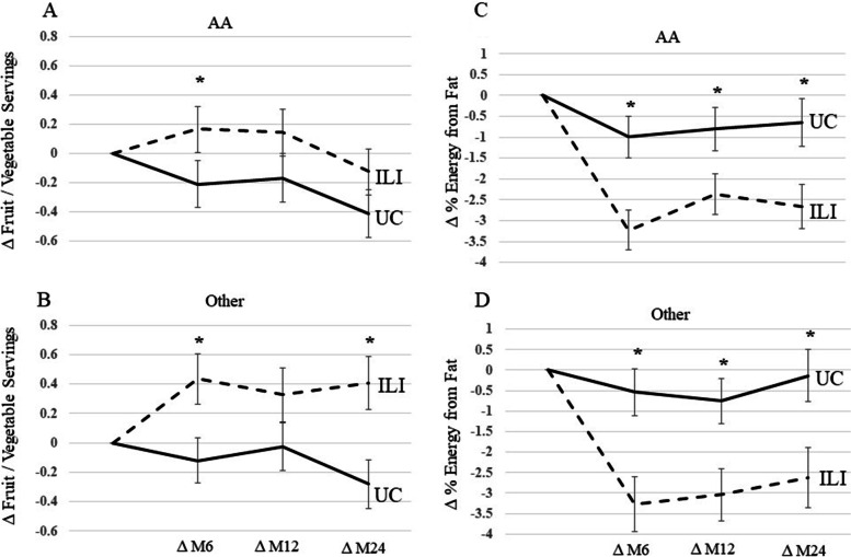 Results: A total of 803 patients were recruited. 84.4% were female, 67.2% African American, 26.1% received Medicaid, and 65.5% made less than $40,000. No differences in F/V intake were seen between the ILI and UC groups at months 6, 12, or 24. The ILI group reduced percent fat at months 6, 12, and 24 compared to UC. Change in F/V intake was negatively correlated with weight change at month 6 whereas change in fat intake was positively associated with weight change at months 6, 12, and 24 for the ILI group.