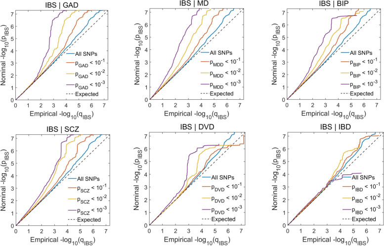 Methods: Using GWAS summary statistics of IBS (53,400 cases and 433,201 controls), and psychiatric and gastrointestinal phenotypes, we performed bivariate casual mixture model analysis to characterize the genetic architecture and genetic overlap between these phenotypes. We leveraged identified genetic overlap to boost the discovery of genomic loci associated with IBS, and to identify specific shared loci associated with both IBS and psychiatric and gastrointestinal phenotypes, using the conditional/conjunctional false discovery rate (condFDR/conjFDR) framework. We used functional mapping and gene annotation (FUMA) for functional analyses.