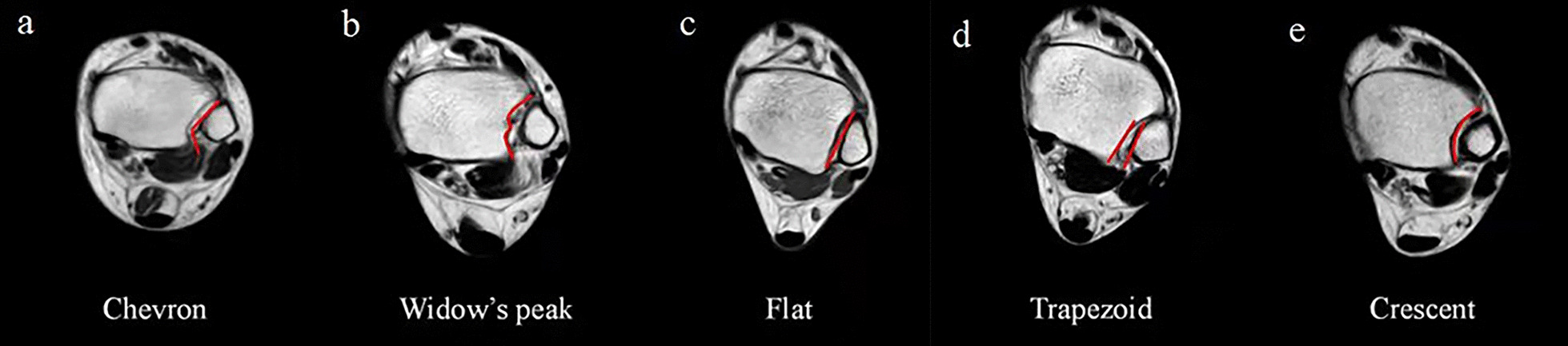 Results: Five morphological classifications of the DTS, including Chevron (19.6%), Widow's peak (16.2%), Flat (22.3%), Trapezoid (32.0%), and Crescent (19.6%), were shown. There were statistical differences between DTS classification and tibial angle surface angle (TAS) (P = .009) and talar tilt angle (TTA) (P = .014). The TAS (degree) of the Crescent (86.47 ± 3.21) was less than Chevron (88.75 ± 2.72) (P = .006), Widow's peak (89.26 ± 3.15) (P = .001), Flat (88.83 ± 3.62) (P = .003) and Trapezoid (88.11 ± 2.62) (P = .041), respectively. The TTA (degree) of Crescent (86.83 ± 5.30) was less than Chevron (89.28 ± 2.46) and Widow's peak (89.82 ± 3.41). The men were greater than women for TAS (P = .008) and angle (P = .003), which are consistent with osteophyte (P = .019) and the modified Kellgren-Lawrence grades (P = .041) between gender.
