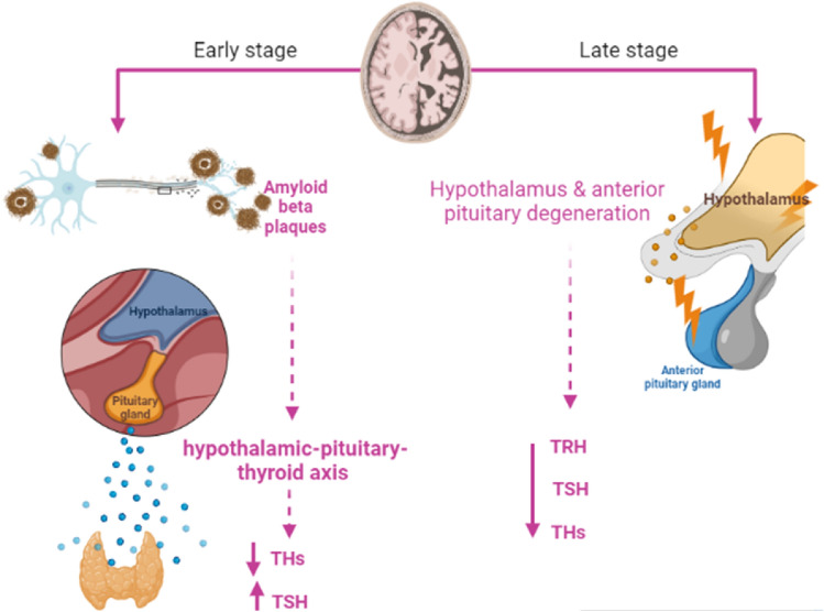 Hypothyroidism (HPT) HPT could be a risk factor for the development and progression of Alzheimer's disease (AD). In addition, progressive neurodegeneration in AD may affect the metabolism of thyroid hormones (THs) in the brain causing local brain HPT. Hence, the present review aimed to clarify the potential association between HPT and AD. HPT promotes the progression of AD by inducing the production of amyloid beta (Aβ) and tau protein phosphorylation with the development of synaptic plasticity and memory dysfunction. Besides, the metabolism of THs is dysregulated in AD due to the accumulation of Aβ and tau protein phosphorylation leading to local brain HPT. Additionally, HPT can affect AD neuropathology through various mechanistic pathways including dysregulation of transthyretin, oxidative stress, ER stress, autophagy dysfunction mitochondrial dysfunction, and inhibition of brain-derived neurotrophic factor. Taken together there is a potential link between HPT and AD, as HPT adversely impacts AD neuropathology and the reverse is also true.