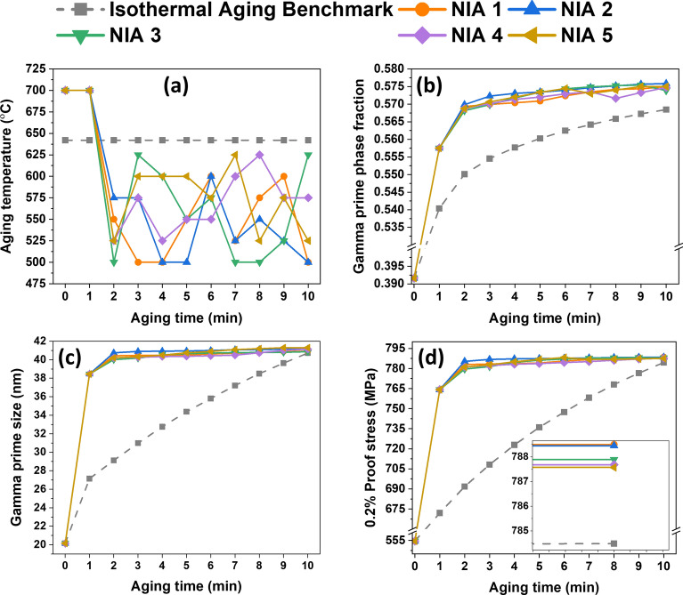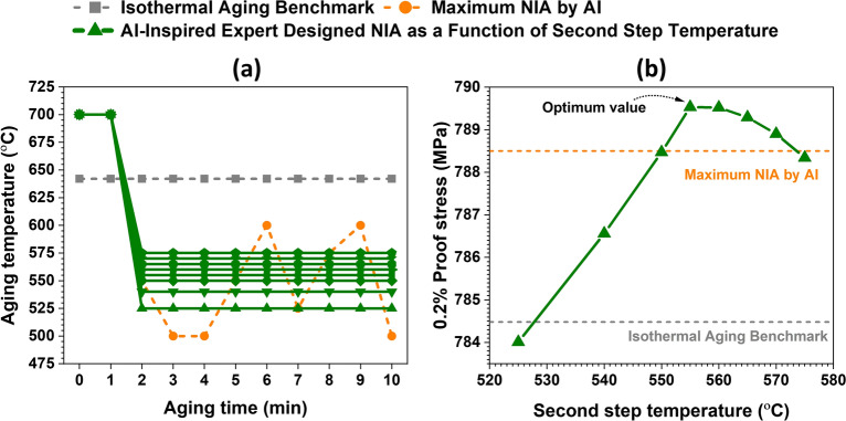 In this paper, a state-of-the-art Artificial Intelligence (AI) technique is used for a precipitation hardening of Ni-based alloy to predict more flexible non-isothermal aging (NIA) and to examine the possible routes for the enhancement in strength that may be practically achieved. Additionally, AI is used to integrate with Materials Integration by Network Technology, which is a computational workflow utilized to model the microstructure evolution and evaluate the 0.2% proof stress for isothermal aging and NIA. As a result, it is possible to find enhanced 0.2% proof stress for NIA for a fixed time of 10 min compared to the isothermal aging benchmark. The entire search space for aging scheduling was ~ 3 billion. Out of 1620 NIA schedules, we succeeded in designing the 110 NIA schedules that outperformed the isothermal aging benchmark. Interestingly, it is found that early-stage high-temperature aging for a shorter time increases the γ' precipitate size up to the critical size and later aging at lower temperature increases the γ' fraction with no anomalous change in γ' size. Therefore, employing this essence from AI, we designed an optimum aging route in which we attained an outperformed 0.2% proof stress to AI-designed NIA routes.