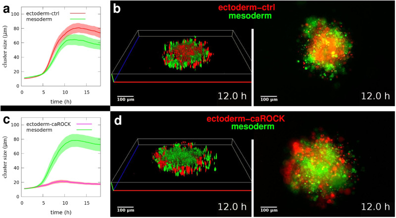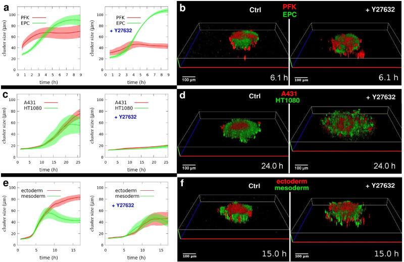 Tissue morphogenesis and patterning during development involve the segregation of cell types. Segregation is driven by differential tissue surface tensions generated by cell types through controlling cell-cell contact formation by regulating adhesion and actomyosin contractility-based cellular cortical tensions. We use vertebrate tissue cell types and zebrafish germ layer progenitors as in vitro models of 3-dimensional heterotypic segregation and developed a quantitative analysis of their dynamics based on 3D time-lapse microscopy. We show that general inhibition of actomyosin contractility by the Rho kinase inhibitor Y27632 delays segregation. Cell type-specific inhibition of non-muscle myosin2 activity by overexpression of myosin assembly inhibitor S100A4 reduces tissue surface tension, manifested in decreased compaction during aggregation and inverted geometry observed during segregation. The same is observed when we express a constitutively active Rho kinase isoform to ubiquitously keep actomyosin contractility high at cell-cell and cell-medium interfaces and thus overriding the interface-specific regulation of cortical tensions. Tissue surface tension regulation can become an effective tool in tissue engineering.
