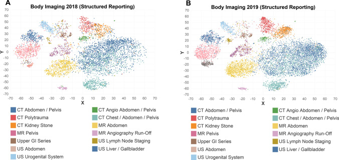 Methods: A total of 747,393 radiology reports dictated between January 2011 and June 2020 were retrospectively analyzed. The body and cardiothoracic imaging divisions introduced a reporting concept using standardized language and structured reporting templates in January 2016. Reports were segmented by a natural language processing algorithm and converted into a 20-dimension document vector. For analysis, dimensionality was reduced to a 2D visualization with t-distributed stochastic neighbor embedding and matched with metadata. Linguistic standardization was assessed by comparing distinct report types' vector spreads (e.g., run-off MR angiography) between reporting standards. Changes in report type distinguishability (e.g., CT abdomen/pelvis vs. MR abdomen) were measured by comparing the distance between their centroids.