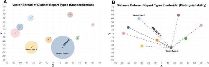 Key points: • Natural language processing and t-distributed stochastic neighbor embedding can transform radiology reports into numeric vectors, allowing the quantification of their linguistic standardization. • Structured reporting substantially increases reports' linguistic standardization (mean: - 27.4% in vector spread) and distinguishability (mean: + 99.3 ± 98.4% increase in vector distance) compared with free-text reports. • Higher standardization and homogeneity outline potential benefits of structured reporting for information transmission and big data analyses.