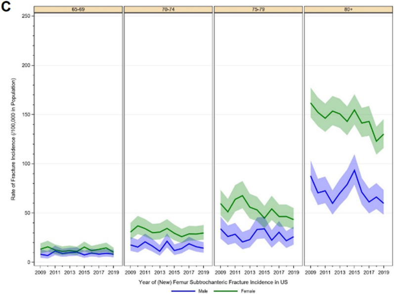 Proximal femoral fractures are a serious complication, especially for elderly patients. Detailed epidemiological analyzes provide a valuable resource for stakeholders in the health care system in order to foresee future development possibly influenceable by adaption of therapeutic procedures and prevention strategies. This work aimed at answering the following research questions: (1) What are the incidence rates of proximal femoral fractures in the elderly U.S. population? (2) What is the preferred treatment procedure for these fractures? Proximal femoral fractures occurred between January 1, 2009 and December 31, 2019 in patients ≥ 65 years were identified from the Medicare Physician Service Records Data Base. The 5% sample of Medicare beneficiaries, equivalent to the records from approximately 2.5 million enrollees formed the basis of this study. Fractures were grouped into head/neck, intertrochanteric, and subtrochanteric fractures. The overall incidence rate, age and sex specific incidence rates as well as incidence rate ratios were calculated. Common Procedural Terminology (CPT) codes were used to identify procedures and operations. In 2019, a total number of 7982 femoral head/neck fractures was recorded. In comparison to 9588 cases in 2009, the incidence substantially decreased by 26.6% from 666.7/100,000 inhabitants to 489.3/100,000 inhabitants (z = - 5.197, p < 0.001). Also, in intertrochanteric fractures, a significant decline in the incidence by 17.3% was evident over the years from 367.7/100,000 inhabitants in 2009 to 304.0 cases per 100,000 inhabitants in 2019 (z = - 2.454, p = 0.014). A similar picture was observable for subtrochanteric fractures, which decreased by 29.6% (51.0 cases per 100,000 to 35.9 cases per 100,000) over the time period (z = - 1.612, p = 0.107). Head/neck fractures were mainly treated with an arthroplasty (n = 36,301, 40.0%). The majority of intertrochanteric fractures and subtrochanteric fractures received treatment with an intramedullary device (n = 34,630, 65.5% and n = 5870, 77.1%, respectively). The analysis indicated that the incidence of all types of proximal femoral neck fractures decreased for the population of elderly patients in the U.S. within the last decade. Treatment of head and neck fractures was mainly conducted through arthroplasty, while intertrochanteric and subtrochanteric fractures predominantly received an intramedullary nailing.