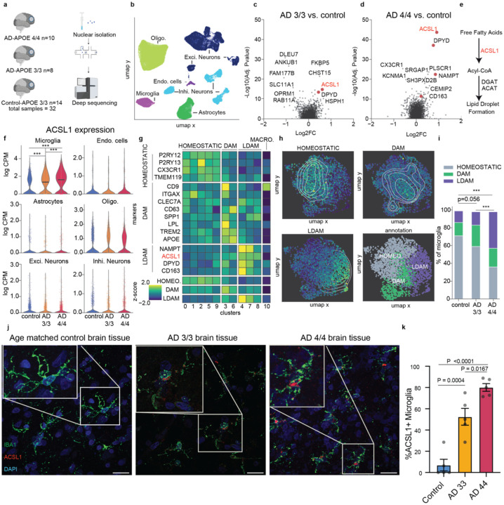 Several genetic risk factors for Alzheimer's Disease (AD) implicate genes involved in lipid metabolism and many of these lipid genes are highly expressed in glial cells. However, the relationship between lipid metabolism in glia and AD pathology remains poorly understood. Through single-nucleus RNA-sequencing of AD brain tissue, we have identified a microglial state defined by the expression of the lipid droplet (LD) associated enzyme ACSL1 with ACSL1-positive microglia most abundant in AD patients with the APOE4/4 genotype. In human iPSC-derived microglia (iMG) fibrillar Aβ (fAβ) induces ACSL1 expression, triglyceride synthesis, and LD accumulation in an APOE-dependent manner. Additionally, conditioned media from LD-containing microglia leads to Tau phosphorylation and neurotoxicity in an APOE-dependent manner. Our findings suggest a link between genetic risk factors for AD with microglial LD accumulation and neurotoxic microglial-derived factors, potentially providing novel therapeutic strategies for AD.