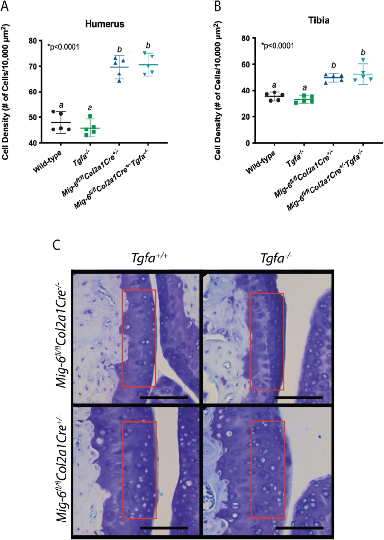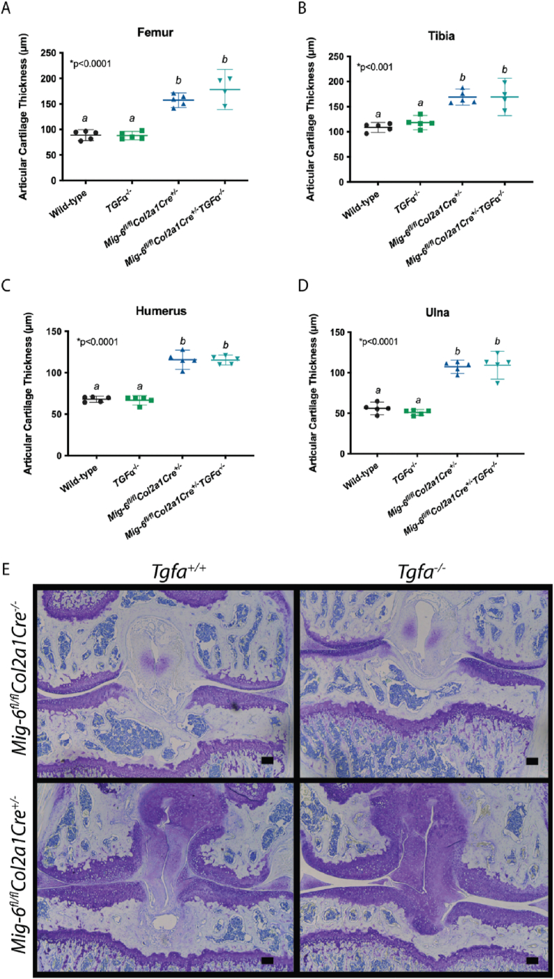 Methods: We generated double knockout mice by crossing cartilage-specific Mig-6fl/flCol2a1-Cre+/- and whole-body Tgfa± mice to generate experimental and control wild-type mice. Knee and elbow sections were used to examine articular cartilage thickness, cell density, and osteoclast presence. Additionally, immunohistochemistry was completed to analyze phospho-EGFR and SOX9.