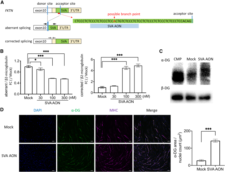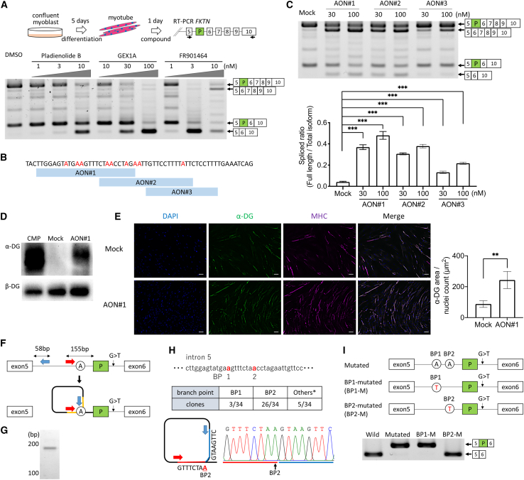 Fukutin (FKTN) c.647+2084G>T creates a pseudo-exon with a premature stop codon, which causes Fukuyama congenital muscular dystrophy (FCMD). We aimed to ameliorate aberrant splicing of FKTN caused by this variant. We screened compounds focusing on splicing regulation using the c.647+2084G>T splicing reporter and discovered that the branchpoint, which is essential for splicing reactions, could be a potential therapeutic target. To confirm the effectiveness of branchpoints as targets for exon skipping, we designed branchpoint-targeted antisense oligonucleotides (BP-AONs). This restored normal FKTN mRNA and protein production in FCMD patient myotubes. We identified a functional BP by detecting splicing intermediates and creating BP mutations in the FKTN reporter gene; this BP was non-redundant and sufficiently blocked by BP-AONs. Next, a BP-AON was designed for a different FCMD-causing variant, which induces pathogenic exon trapping by a common SINE-VNTR-Alu-type retrotransposon. Notably, this BP-AON also restored normal FKTN mRNA and protein production in FCMD patient myotubes. Our findings suggest that BPs could be potential targets in exon-skipping therapeutic strategies for genetic disorders.