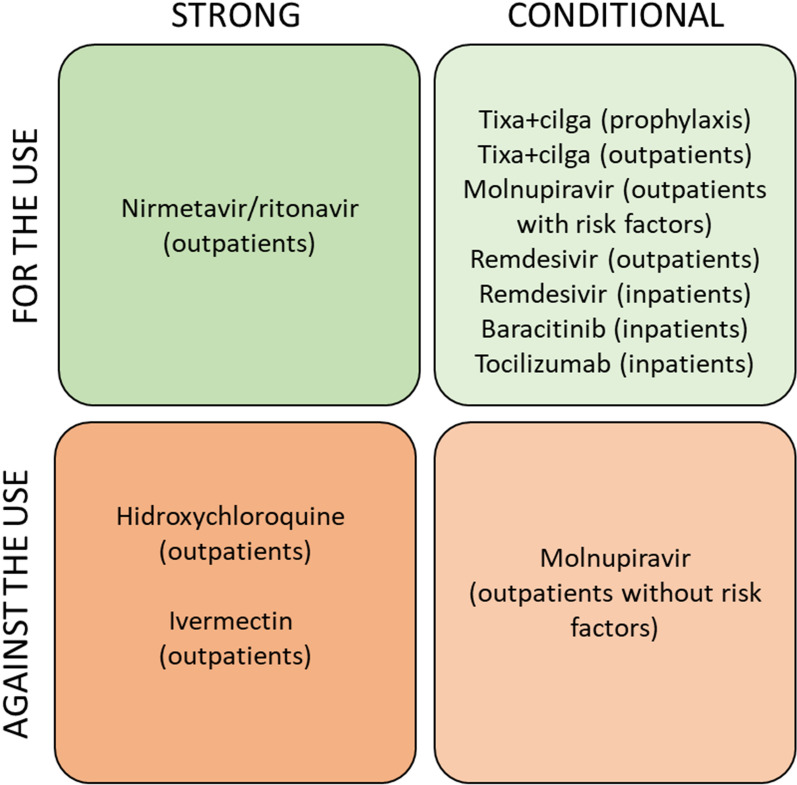 Results: Nine technologies were evaluated, and ten recommendations were made, including the use of tixagevimab + cilgavimab in the prophylaxis of COVID-19, tixagevimab + cilgavimab, molnupiravir, nirmatrelvir + ritonavir, and remdesivir in the treatment of outpatients, and remdesivir, baricitinib, and tocilizumab in the treatment of hospitalised patients with severe COVID-19. The use of hydroxychloroquine or chloroquine and ivermectin was discouraged.