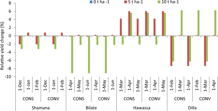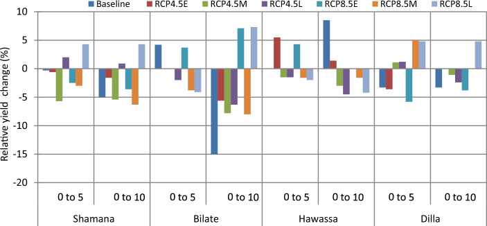 In this study, we assessed responses of adaptation options to possible climate change scenarios on maize growth and yield by using projections of 20 coupled ensemble climate models under two representative concentration pathways (RCPs) 4.5 and 8.5 by means of a DSSAT model. Growth and yield simulations were made across present and future climate conditions using the hybrid maize variety (Shone). Subsequently, simulated yields were compared with farmer' average and on-farm trial yields. Results showed that on-farm trial yield (5.1-7.3 t ha-1) lay in between farmers' average yield (2.9-5 t ha-1) and water-limited potential yield (6.3-10.6 t ha-1). Maize yields achieved in farmers' fields are projected to decline towards mid-century and further towards the end of the century regardless of the adaptation options compared with baseline in low potential clusters. Results of a combination of adaptation options including February planting, use of 64 kg ha-1 N and conservation tillage provided yield advantage of 5.8% over the 30 cm till under medium GHGs emission scenario during mid-century period at Shamana. Mulching with 5 t ha-1 was projected to produce a 4-5% yield advantage in the Hawassa cluster during the mid-century period regardless of changes in tillage or planting window. Under a high GHGs emission scenario, over 13.4% yield advantage was projected in the Bilate cluster due to conservation tillage and June planting during the mid-century period. In the Dilla cluster, the use of 10 t ha-1 mulch, conservation tillage and early planting (February) would result in a 1.8% yield advantage compared with the control either in medium or high GHGs emission scenarios. Thus, the most promising and least risky practices among simulated strategies were the use of nitrogen and mulching in combination with tillage or planting date adjustment. However, adaptation options remained least promising and highly risky if not integrated with mulching or nitrogen use. Hence, the negative impacts of future climate change and subsequent yield gaps would be reduced by optimizing the application of nitrogen, mulch and their interaction with planting date and tillage in high and low potential areas of maize production.