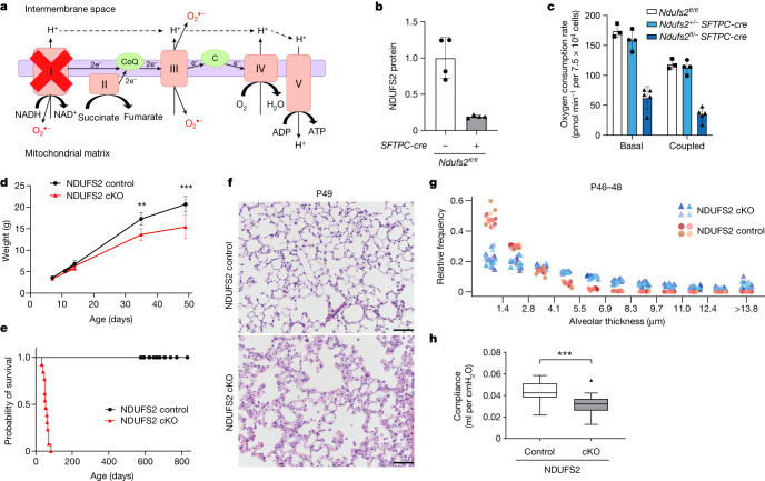 Alveolar epithelial type 1 (AT1) cells are necessary to transfer oxygen and carbon dioxide between the blood and air. Alveolar epithelial type 2 (AT2) cells serve as a partially committed stem cell population, producing AT1 cells during postnatal alveolar development and repair after influenza A and SARS-CoV-2 pneumonia1-6. Little is known about the metabolic regulation of the fate of lung epithelial cells. Here we report that deleting the mitochondrial electron transport chain complex I subunit Ndufs2 in lung epithelial cells during mouse gestation led to death during postnatal alveolar development. Affected mice displayed hypertrophic cells with AT2 and AT1 cell features, known as transitional cells. Mammalian mitochondrial complex I, comprising 45 subunits, regenerates NAD+ and pumps protons. Conditional expression of yeast NADH dehydrogenase (NDI1) protein that regenerates NAD+ without proton pumping7,8 was sufficient to correct abnormal alveolar development and avert lethality. Single-cell RNA sequencing revealed enrichment of integrated stress response (ISR) genes in transitional cells. Administering an ISR inhibitor9,10 or NAD+ precursor reduced ISR gene signatures in epithelial cells and partially rescued lethality in the absence of mitochondrial complex I function. Notably, lung epithelial-specific loss of mitochondrial electron transport chain complex II subunit Sdhd, which maintains NAD+ regeneration, did not trigger high ISR activation or lethality. These findings highlight an unanticipated requirement for mitochondrial complex I-dependent NAD+ regeneration in directing cell fate during postnatal alveolar development by preventing pathological ISR induction.