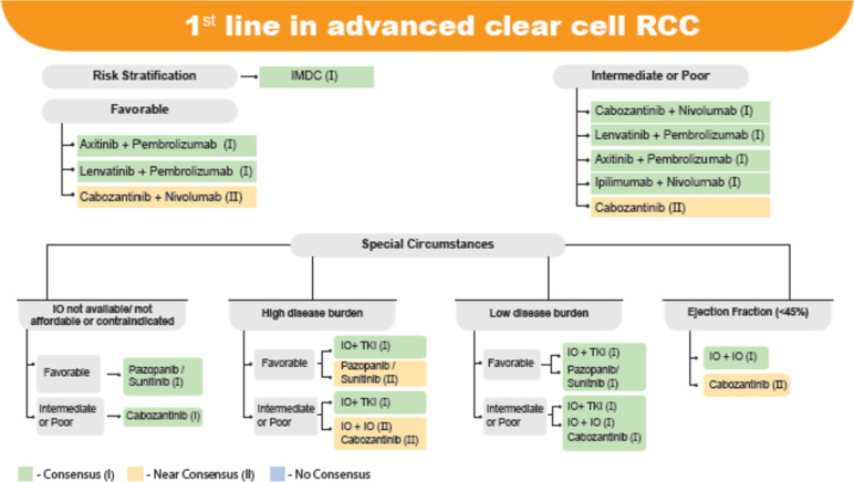 In advanced Renal Cell Carcinoma (aRCC), systemic therapy is the mainstay of treatment, with no or little role for surgery in these patients. Tyrosine kinase inhibitors (TKIs) and immune-oncological (IOs) therapies, either alone or in combination, are recommended in these patients depending on patient and tumour factors. The sequencing of therapies is critical in RCC because the choice of subsequent line therapy is heavily dependent on the response and duration of the previous treatment. There are additional barriers to RCC treatment in India. Immunotherapy is the cornerstone of treatment in ccRCC, but it is prohibitively expensive and not always reimbursed, effectively putting it out of reach for the vast majority of eligible patients in India. Furthermore, in advanced RCC (particularly the clear cell variety), Indian oncologists consider the disease burden of the patients, which is particularly dependent on the quantum of the disease load, clinical symptoms, and performance status of the patient, before deciding on treatment. There are no India-specific guidelines for clear cell RCC (ccRCC) treatment or the positioning and sequencing of molecules in the management of advanced ccRCC that take these country-specific issues into account. The current consensus article provides expert recommendations and treatment algorithms based on existing clinical evidence, which will be useful to specialists managing advanced ccRCC.