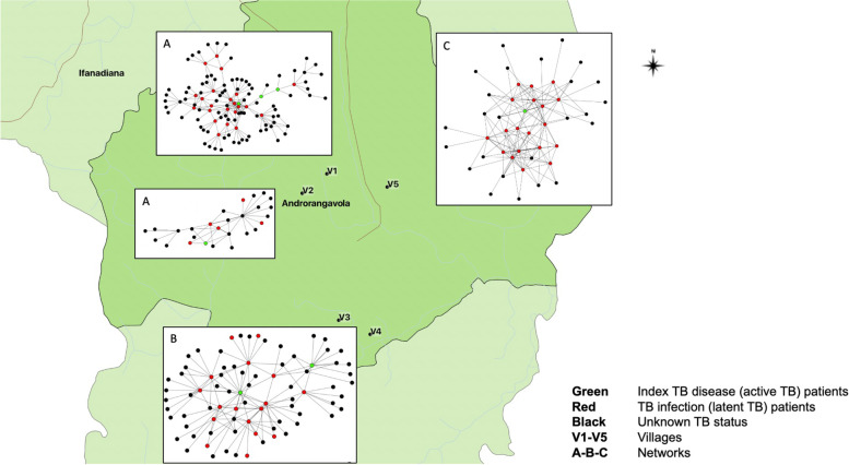 Methods: We collected social contact data in five villages and built SNA-informed village-specific stochastic TB transmission models in remote Madagascar. A name-generator approach was used to elicit individual contact networks. Recruitment included confirmed TB patients, followed by snowball sampling of named contacts. Egocentric network data were aggregated into village-level networks. Network- and individual-level characteristics determining contact formation and structure were identified by fitting an exponential random graph model (ERGM), which formed the basis of the contact structure and model dynamics. Models were calibrated and used to evaluate WHO-recommended interventions and community resiliency to foreign TB introduction.