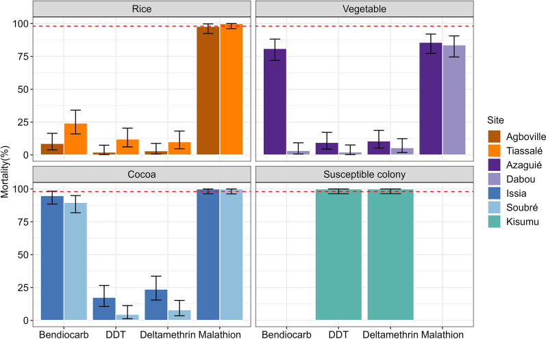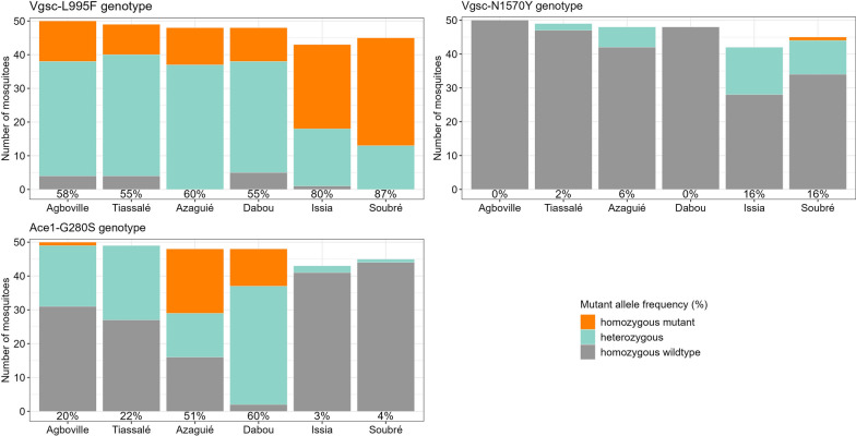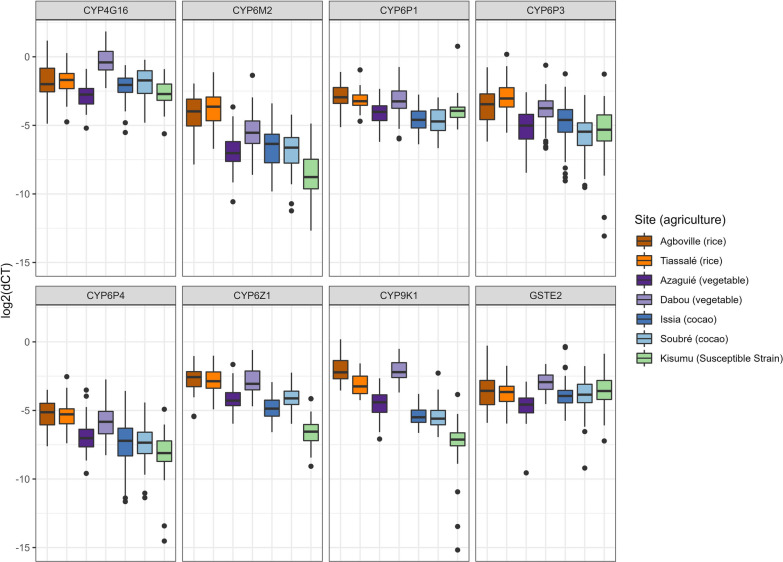Results: The An. gambiae s.l. populations from all six agricultural sites were resistant to bendiocarb, deltamethrin and DDT, while the populations from the two vegetable cultivation sites were additionally resistant to malathion. Most tested mosquitoes carried at least one mutant Vgsc-L995F allele that is associated with pyrethroid and DDT resistance. In the cocoa cultivation sites, we observed the highest 995F frequencies (80-87%), including a majority of homozygous mutants and several in co-occurrence with the Vgsc-N1570Y mutation. We detected the Ace1 mutation most frequently in vegetable-growing sites (51-60%), at a moderate frequency in rice (20-22%) and rarely in cocoa-growing sites (3-4%). In contrast, CYP6M2, CYP6P3, CYP6P4, CYP6Z1 and CYP9K1, previously associated with metabolic insecticide resistance, showed the highest expression levels in the populations from rice-growing sites compared to the susceptible Kisumu reference strain.