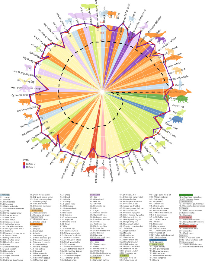The Regents of the University of California filed a patent application (publication number WO2020150705) related to this work on which S.H., A. Arneson and J.E. are named inventors. S.H. and R.T.B. are founders of the non-profit Epigenetic Clock Development Foundation, which has licensed several patents from UC Regents, and distributes the mammalian methylation array. The remaining authors declare no competing interests.