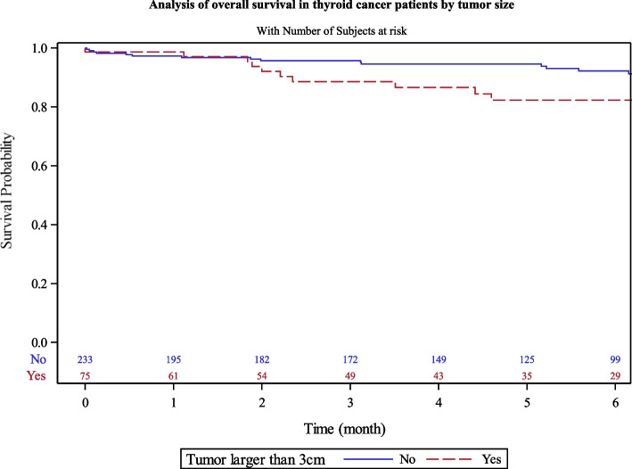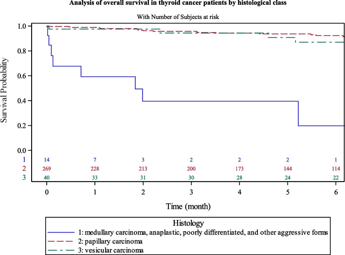 Results: A total of 323 thyroid cancer patients were registered between 2008 and 2018. Papillary carcinomas represented 83% of diagnoses. Local stage or locally advanced invasion was found in 264 (88%) patients. 221 Multidisciplinary Teams reports files were reviewed. The overall survival observed in this population is 97% [93-99] at 1 year, 93% [88-97] at 3 years and 91% [85-95] at 5 years. Anaplastic, poorly differentiated and medullar tumors had lower survival rates at 5 years (39% [13-65]) compared to papillary tumors (93% [89-96]). We found that metastatic stage at diagnosis (HR = 3.1[1.3-7.6]; p = 0.01) and tumor size > 3 cm (HR = 2.7 [1.1-6.3]) were independent prognostic factors for OS in our population.