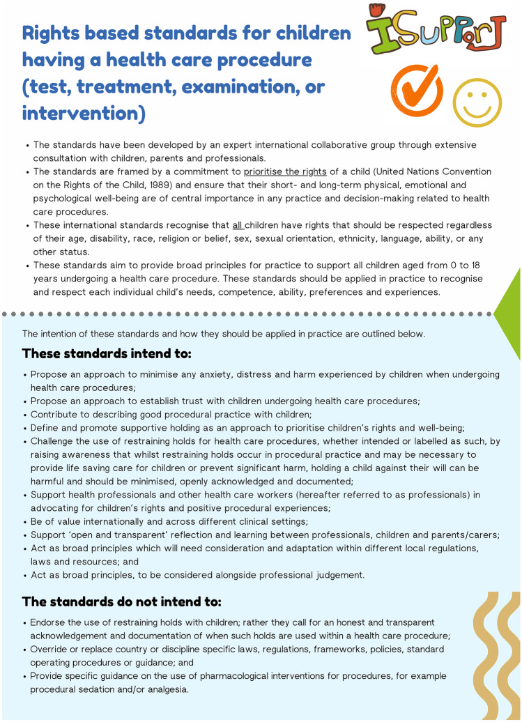 Children continue to experience harm when undergoing clinical procedures despite increased evidence of the need to improve the provision of child-centred care. The international ISupport collaboration aimed to develop standards to outline and explain good procedural practice and the rights of children within the context of a clinical procedure. The rights-based standards for children undergoing tests, treatments, investigations, examinations and interventions were developed using an iterative, multi-phased, multi-method and multi-stakeholder consensus building approach. This consensus approach used a range of online and face to face methods across three phases to ensure ongoing engagement with multiple stakeholders. The views and perspectives of 203 children and young people, 78 parents and 418 multi-disciplinary professionals gathered over a two year period (2020-2022) informed the development of international rights-based standards for the care of children having tests, treatments, examinations and interventions. The standards are the first to reach international multi-stakeholder consensus on definitions of supportive and restraining holds. Conclusion: This is the first study of its kind which outlines international rights-based procedural care standards from multi-stakeholder perspectives. The standards offer health professionals and educators clear evidence-based tools to support discussions and practice changes to challenge prevailing assumptions about holding or restraining children and instead encourage a focus on the interests and rights of the child. What is Known: • Children continue to experience short and long-term harm when undergoing clinical procedures despite increased evidence of the need to improve the provision of child-centred care. • Professionals report uncertainty and tensions in applying evidence-based practice to children's procedural care. What is New: • This is the first study of its kind which has developed international rights-based procedural care standards from multi-stakeholder perspectives. • The standards are the first to reach international multi-stakeholder consensus on definitions of supportive and restraining holds.