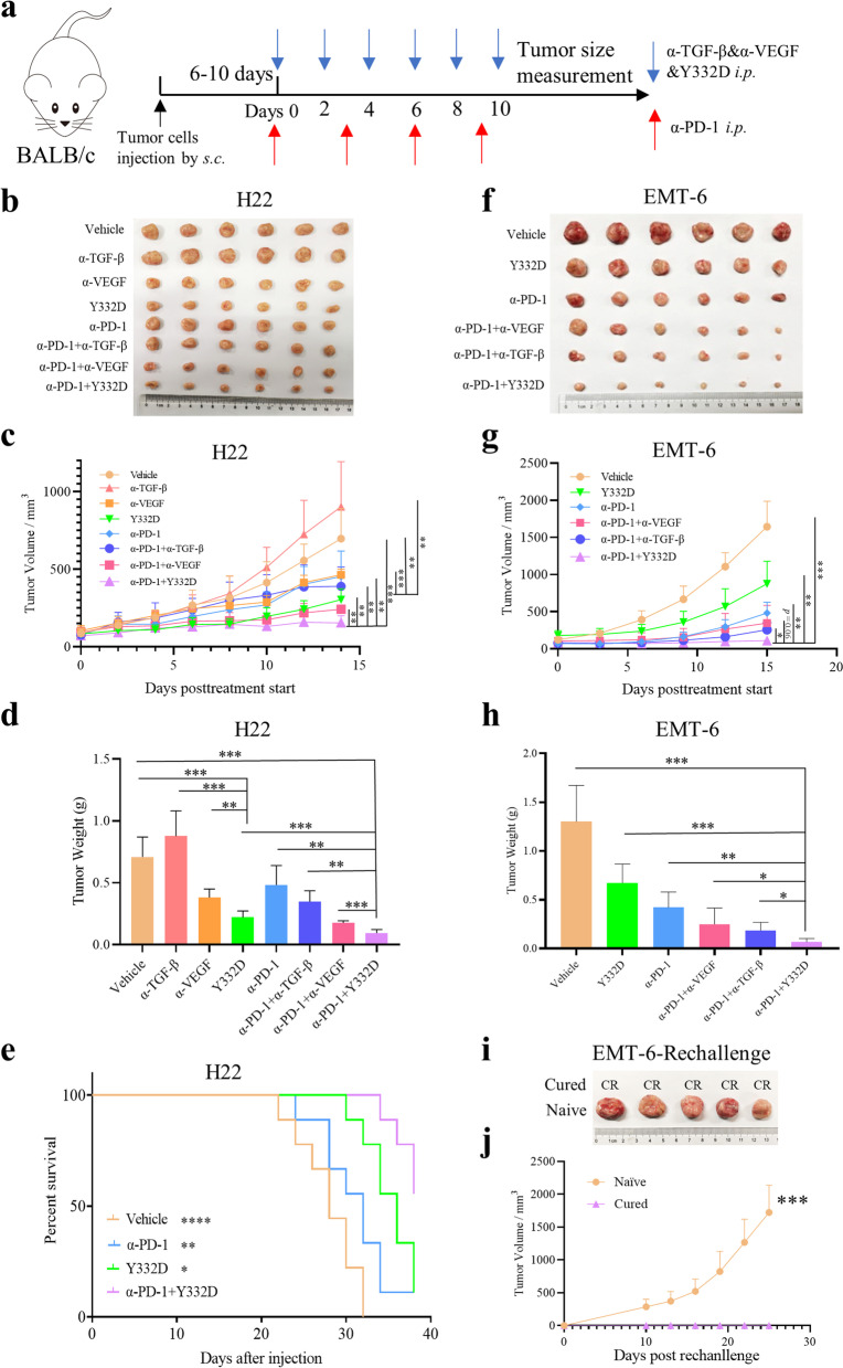 Conclusion: Y332D could simultaneously block TGF-β and VEGF signalings. In comparison with the monotherapies, Y332D combined with PD-1 blockade exerts superior antitumor effect through improving immune microenvironment.