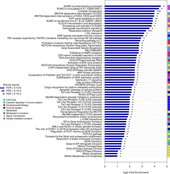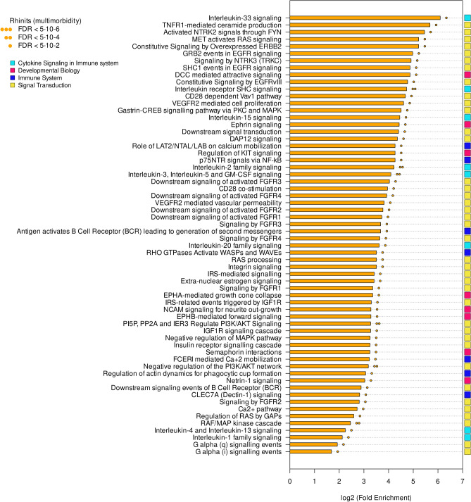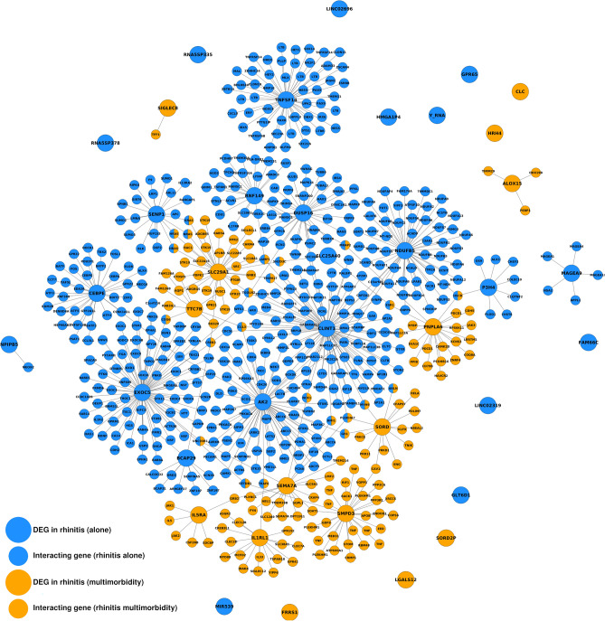 The concept of "one-airway-one-disease", coined over 20 years ago, may be an over-simplification of the links between allergic diseases. Genomic studies suggest that rhinitis alone and rhinitis with asthma are operated by distinct pathways. In this MeDALL (Mechanisms of the Development of Allergy) study, we leveraged the information of the human interactome to distinguish the molecular mechanisms associated with two phenotypes of allergic rhinitis: rhinitis alone and rhinitis in multimorbidity with asthma. We observed significant differences in the topology of the interactomes and in the pathways associated to each phenotype. In rhinitis alone, identified pathways included cell cycle, cytokine signalling, developmental biology, immune system, metabolism of proteins and signal transduction. In rhinitis and asthma multimorbidity, most pathways were related to signal transduction. The remaining few were related to cytokine signalling, immune system or developmental biology. Toll-like receptors and IL-17-mediated signalling were identified in rhinitis alone, while IL-33 was identified in rhinitis in multimorbidity. On the other hand, few pathways were associated with both phenotypes, most being associated with signal transduction pathways including estrogen-stimulated signalling. The only immune system pathway was FceRI-mediated MAPK activation. In conclusion, our findings suggest that rhinitis alone and rhinitis and asthma multimorbidity should be considered as two distinct diseases.
