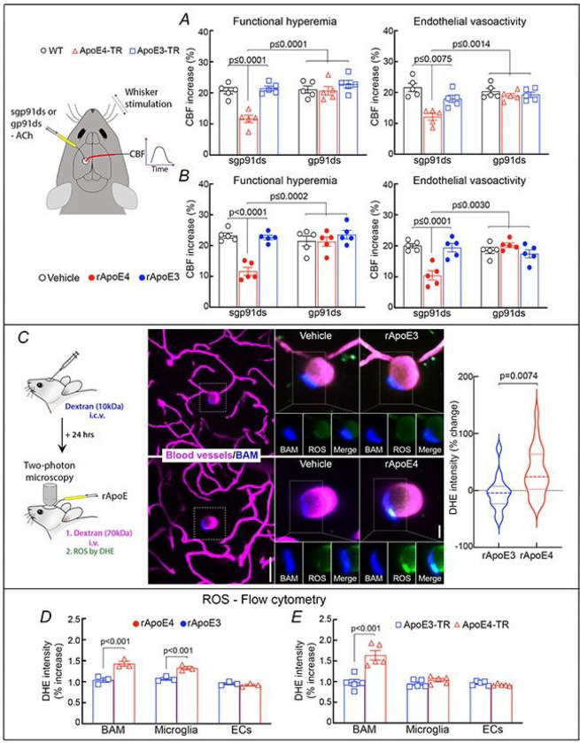 Apolipoprotein-E4 (ApoE4), the strongest genetic risk factor for sporadic Alzheimer's disease, is also a risk factor for microvascular pathologies leading to cognitive impairment, particularly subcortical white matter injury. These effects have been attributed to alterations in the regulation of the brain blood supply, but the cellular source of ApoE4 and the underlying mechanisms remain unclear. In mice expressing human ApoE3 or ApoE4 we report that border associated macrophages (BAM), myeloid cells closely apposed to neocortical microvessels, are both the source and the target of the ApoE4 mediating the neurovascular dysfunction through reactive oxygen species. ApoE4 in BAM is solely responsible for the increased susceptibility to oligemic white matter damage in ApoE4 mice and is sufficient to enhance damage in ApoE3 mice. The data unveil a new aspect of BAM pathobiology and highlight a previously unrecognized cell autonomous role of BAM in the neurovascular dysfunction of ApoE4 with potential therapeutic implications.