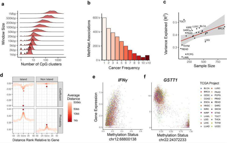 Aberrations in the capacity of DNA/chromatin modifiers and transcription factors to bind non-coding regions can lead to changes in gene regulation and impact disease phenotypes. However, identifying distal regulatory elements and connecting them with their target genes remains challenging. Here, we present MethNet, a pipeline that integrates large-scale DNA methylation and gene expression data across multiple cancers, to uncover novel cis regulatory elements (CREs) in a 1Mb region around every promoter in the genome. MethNet identifies clusters of highly ranked CREs, referred to as 'hubs', which contribute to the regulation of multiple genes and significantly affect patient survival. Promoter-capture Hi-C confirmed that highly ranked associations involve physical interactions between CREs and their gene targets, and CRISPRi based scRNA Perturb-seq validated the functional impact of CREs. Thus, MethNet-identified CREs represent a valuable resource for unraveling complex mechanisms underlying gene expression, and for prioritizing the verification of predicted non-coding disease hotspots.