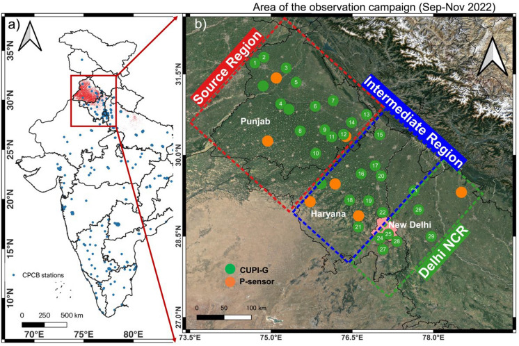Exposure to particulate matter less than 2.5 µm in diameter (PM2.5) is a cause of concern in cities and major emission regions of northern India. An intensive field campaign involving the states of Punjab, Haryana and Delhi national capital region (NCR) was conducted in 2022 using 29 Compact and Useful PM2.5 Instrument with Gas sensors (CUPI-Gs). Continuous observations show that the PM2.5 in the region increased gradually from < 60 µg m-3 in 6-10 October to up to 500 µg m-3 on 5-9 November, which subsequently decreased to about 100 µg m-3 in 20-30 November. Two distinct plumes of PM2.5 over 500 µg m-3 are tracked from crop residue burning in Punjab to Delhi NCR on 2-3 November and 10-11 November with delays of 1 and 3 days, respectively. Experimental campaign demonstrates the advantages of source region observations to link agricultural waste burning and air pollution at local to regional scales.
