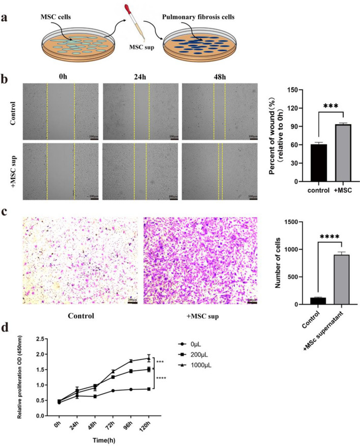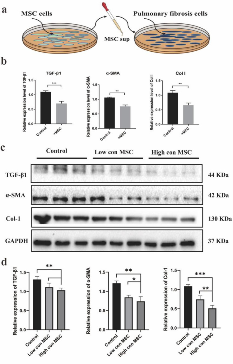 Idiopathic pulmonary fibrosis (IPF) is a chronic, progressive respiratory disease. Arguably, the complex interplay between immune cell subsets, coupled with an incomplete understanding of disease pathophysiology, has hindered the development of successful therapies. Despite efforts to understand its pathophysiology and develop effective treatments, IPF remains a fatal disease, necessitating the exploration of new treatment options. Mesenchymal stromal/stem cell (MSC) therapy has shown promise in experimental models of IPF, but further investigation is needed to understand its therapeutic effect. This study aimed to assess the therapeutic effect of adipose-derived mesenchymal stem cells in a bleomycin-induced pulmonary fibrosis model. First, MSC cells were obtained from mice and characterized using flow cytometry and cell differentiation culture methods. Then adult C57BL/6 mice were exposed to endotracheal instillation of bleomycin and concurrently treated with MSCs for reversal models on day 14. Experimental groups were evaluated on days 14, 21, or 28. Additionally, lung fibroblasts challenged with TGF-β1 were treated with MSCs supernatant or MSCs to explore the mechanisms underlying of pulmonary fibrosis reversal. Mesenchymal stem cells were successfully isolated from mouse adipose tissue and characterized based on their differentiation ability and cell phenotype. The presence of MSCs or their supernatant stimulated the proliferation and migration of lung fibrotic cells. MSCs supernatant reduced lung collagen deposition, improved the Ashcroft score and reduced the gene and protein expression of lung fibrosis-related substances. Bleomycin-challenged mice exhibited severe septal thickening and prominent fibrosis, which was effectively reversed by MSCs treatment. MSC supernatant could suppress the TGF-β1/Smad signaling pathway and supernatant promotes fibroblast autophagy. In summary, this study demonstrates that MSCs supernatant treatment is as effective as MSCs in revert the core features of bleomycin-induced pulmonary fibrosis. The current study has demonstrated that MSCs supernatant alleviates the BLM-induced pulmonary fibrosis in vivo. In vitro experiments further reveal that MSC supernatant could suppress the TGF-β1/Smad signaling pathway to inhibit the TGF-β1-induced fibroblast activation, and promotes fibroblast autophagy by Regulating p62 expression. These findings contribute to the growing body of evidence supporting the therapeutic application of MSCs in cell therapy medicine for IPF.