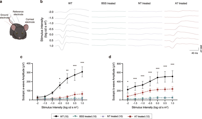 Base editing technology is an ideal solution for treating pathogenic single-nucleotide variations (SNVs). No gene editing therapy has yet been approved for eye diseases, such as retinitis pigmentosa (RP). Here, we show, in the rd10 mouse model, which carries an SNV identified as an RP-causing mutation in human patients, that subretinal delivery of an optimized dual adeno-associated virus system containing the adenine base editor corrects the pathogenic SNV in the neuroretina with up to 49% efficiency. Light microscopy showed that a thick and robust outer nuclear layer (photoreceptors) was preserved in the treated area compared with the thin, degenerated outer nuclear layer without treatment. Substantial electroretinogram signals were detected in treated rd10 eyes, whereas control treated eyes showed minimal signals. The water maze experiment showed that the treatment substantially improved vision-guided behavior. Together, we construct and validate a translational therapeutic solution for the treatment of RP in humans. Our findings might accelerate the development of base-editing based gene therapies.