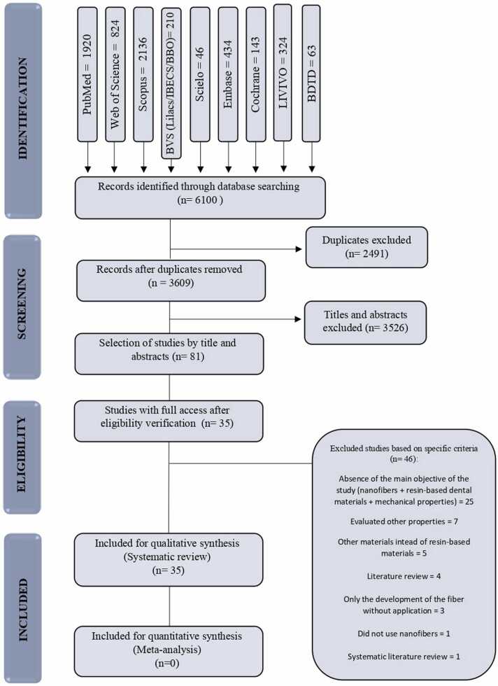 This systematic review provides an update on the effect of nanofibers as reinforcement on resin-based dental materials. A bibliographic search was conducted in MEDLINEPubMed, Embase, Web of Science, Scopus, BVS (LILACS, BBO e IBECS), Cochrane, LIVIVO, and gray literature (BDTD) to identify relevant articles up to May 2021. In vitro studies that evaluated and compared the mechanical properties of nanofibers resin-based composite materials, were eligible. No publication year or language restriction was applied, and methodological quality was assessed using two methods. In a total of 6100 potentially eligible studies, 81 were selected for full-text analysis and 35 were included for qualitative analysis. Of the 35 included studies, a total of 29 studies evaluated the flexural strength (FS) of the materials. These groups were distinguished according to the resin-based materials tested and nanofiber types. Most of the studies evaluated materials composed of glass fibers and demonstrated higher values of FS when compared to resin-based materials without nanofibers. The incorporation of nanofibers into resin-based dental materials improved the mechanical properties compared to resin-based materials without nanofibers, suggesting better performance of these materials in high-stressbearing application areas. Further clinical studies are required to confirm the efficacy of resin-based materials with nanofibers.