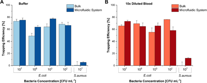 Herein, A microfluidic device is described, produced with a 3D-printed master mould that rapidly separates and concentrates Escherichia coli directly from whole blood samples, enabling a reduction in the turnaround time of bloodstream infections (BSIs) diagnosis. Moreover, it promotes the cleansing of the blood samples whose complexity frequently hampers bacterial detection. The device comprises a serpentine mixing channel with two inlets, one for blood samples (spiked with bacteria) and the other for magnetic nanoparticles (MNPs) functionalized with a (bacterio)phage receptor-binding protein (RBP) with high specificity for E. coli. After the magnetic labelling of bacteria throughout the serpentine, the microchannel ends with a trapping reservoir where bacteria-MNPs conjugates are concentrated using a permanent magnet. The optimized sample preparation device successfully recovered E. coli (on average, 66%) from tenfold diluted blood spiked within a wide range of bacterial load (102 CFU to 107 CFU mL-1). The non-specific trapping, tested with Staphylococcus aureus, was at a negligible level of 12%. The assay was performed in 30 min directly from diluted blood thus presenting an advantage over the conventional enrichment in blood cultures (BCs). The device is simple and cheap to fabricate and can be tailored for multiple bacterial separation from complex clinical samples by using RBPs targeting different species. Moreover, the possibility to integrate a biosensing element to detect bacteria on-site can provide a reliable, fast, and cost-effective point-of-care device.