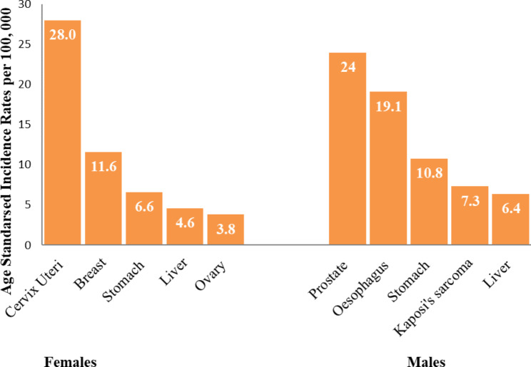Methods: A retrospective population study was conducted in 2018 to identify all newly diagnosed cancer cases between 2013 and 2017 in Mbarara district. Data were extracted from the medical records of health facilities within Mbarara and from national and regional centres that provide cancer care services. Cases were coded according to the International Classification of Diseases for Oncology (ICD-0-03). Data was analysed using CanReg5 and Excel.
