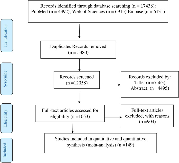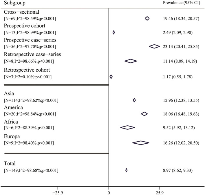 Results: Among 17,438 reports screened, we assessed 1053 full-text articles for eligibility; 149 were included in the final analysis, comprising data from 32 countries. The highest and lowest prevalence was observed in America (pooled prevalence: 18.06%; 95% CI: 16.48 - 19.63; I2: 98.84%) and Africa (pooled prevalence: 9.52%; 95% CI: 5.92 - 13.12; I2: 88.39%). Among individual countries, Japan had the highest pooled prevalence of GC in H. pylori positive patients (Prevalence: 90.90%:95% CI: 83.61-95.14), whereas Sweden had the lowest prevalence (Prevalence: 0.07%; 95% CI: 0.06-0.09). The highest and lowest prevalence was observed in prospective case series (pooled prevalence: 23.13%; 95% CI: 20.41 - 25.85; I2: 97.70%) and retrospective cohort (pooled prevalence: 1.17%; 95% CI: 0.55 - 1.78; I 2: 0.10%).