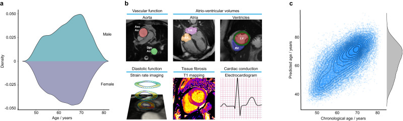 Cardiovascular ageing is a process that begins early in life and leads to a progressive change in structure and decline in function due to accumulated damage across diverse cell types, tissues and organs contributing to multi-morbidity. Damaging biophysical, metabolic and immunological factors exceed endogenous repair mechanisms resulting in a pro-fibrotic state, cellular senescence and end-organ damage, however the genetic architecture of cardiovascular ageing is not known. Here we use machine learning approaches to quantify cardiovascular age from image-derived traits of vascular function, cardiac motion and myocardial fibrosis, as well as conduction traits from electrocardiograms, in 39,559 participants of UK Biobank. Cardiovascular ageing is found to be significantly associated with common or rare variants in genes regulating sarcomere homeostasis, myocardial immunomodulation, and tissue responses to biophysical stress. Ageing is accelerated by cardiometabolic risk factors and we also identify prescribed medications that are potential modifiers of ageing. Through large-scale modelling of ageing across multiple traits our results reveal insights into the mechanisms driving premature cardiovascular ageing and reveal potential molecular targets to attenuate age-related processes.