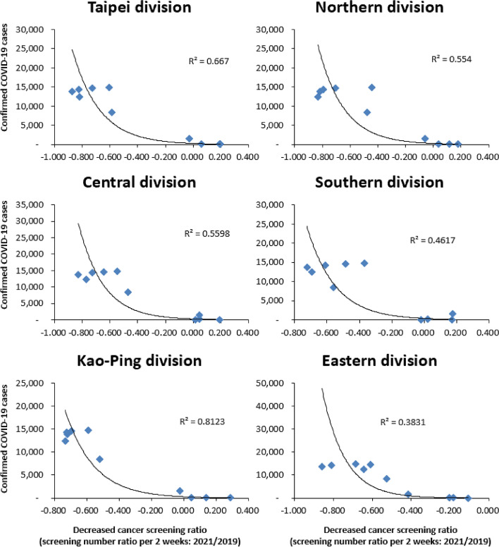 Results: Through our results we found that total cancer screening numbers decreased from 307,547 to 103,289 (a 66% decrease) from the years 2020 to 2021. Specifically, a 63%, 79%, 65% and 71% decrease in screening cases was seen for colon cancer, oral cancer, cervical cancer and breast cancer, respectively, during that period. A similar condition was noticed when comparing 2019 to 2021 when the disclosed total cancer screening numbers decreased by 70% (2019-2021); 65%, 83%, 70% and 76% in colon cancer, oral cancer, cervical cancer and breast cancer, respectively. Among these various cancer screenings, oral cancer screening showed the greatest reduction rate (a drop of 83% compared to 2019 and 79% compared to 2020). We also compared the reduction rates taken from different regions in Taiwan. It was in Taipei, where most COVID-19 cases were noted, that the greatest reduction rate of cancer screening numbers occurred (a drop of76% compared to 2019 and 74% compared to 2020). A proportional decrease of screening cases was also noticed in all areas when confirmed COVID-19 cases rose.