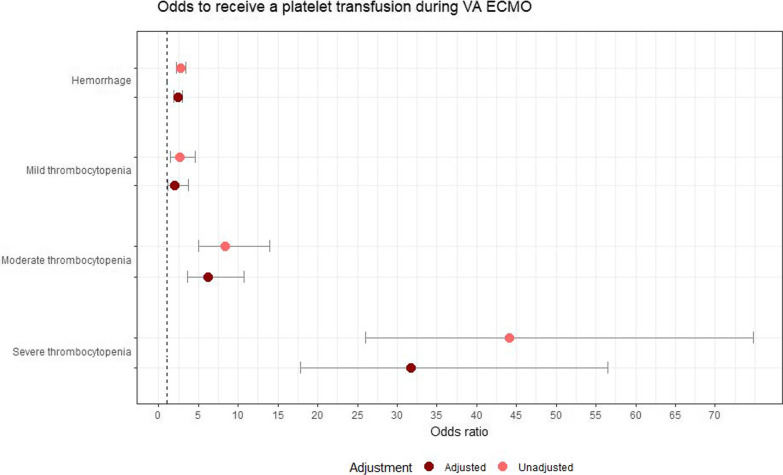 Results: Of the 419 patients included, median platelet count at admission was 179·109/L. During VA ECMO, almost all (N = 398, 95%) patients developed a thrombocytopenia, of which a significant part severe (N = 179, 45%). One or more platelet transfusions were administered in 226 patients (54%), whereas 207 patients (49%) suffered a hemorrhagic event during VA ECMO. In non-bleeding patients, still one in three patients received a platelet transfusion. The strongest association to receive a platelet transfusion was found in the presence of severe thrombocytopenia (adjusted OR 31.8, 95% CI 17.9-56.5). After including an interaction term of hemorrhage and thrombocytopenia, this even increased up to an OR of 110 (95% CI 34-360).