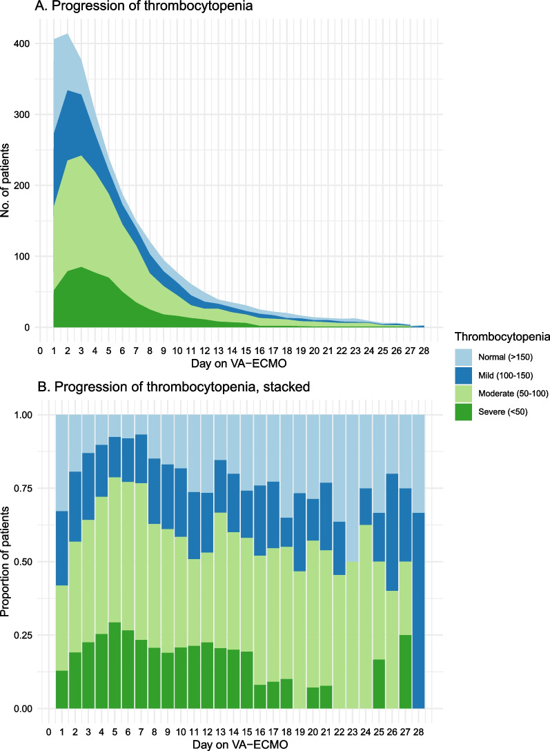 Background: Thrombocytopenia, hemorrhage and platelet transfusion are common in patients supported with venoarterial extracorporeal membrane oxygenation (VA ECMO). However, current literature is limited to small single-center experiences with high degrees of heterogeneity. Therefore, we aimed to ascertain in a multicenter study the course and occurrence rate of thrombocytopenia, and to assess the association between thrombocytopenia, hemorrhage and platelet transfusion during VA ECMO.