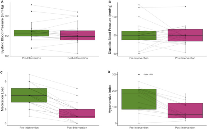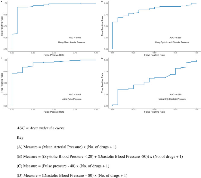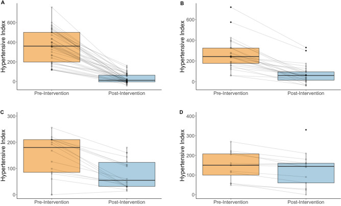 A key limitation in assessing the therapeutic impact of non-pharmacological approaches to treating hypertension is the method of reporting outcomes. Reducing the medications required to achieve the same blood pressure may be reported separately to a reduction in the blood pressure without change in medication, and thus lessen the reported beneficial impact of treatment. This study aims to derive a novel scoring system to gauge the therapeutic impact of non-drug treatment of hypertension by utilising a combination of excessive blood pressure and the number of anti-hypertensives into a combined score-the hypertensive index (HTi). The hypertensive index was empirically derived based on the systolic blood pressure and number of antihypertensive drugs, and applied retrospectively to a cohort undergoing intervention for renovascular hypertension. Subgroup and receiver operating characteristic analyses were used to compare the HTi to traditional methods of reporting outcomes. Following intervention (99 patients), 46% had improvement in both medication load and blood pressure, 29% had benefit in blood pressure without reduction in medication load, 15% had reduction in medication load without significant change in blood pressure and 9% showed no benefit in either parameter. The HTi was superior in detecting benefit from intervention compared with measuring blood pressure or medication load alone (AUC 0.94 vs 0.85;0.84). The hypertensive index may be a more sensitive marker of treatment effect than assessing blood pressure measurements alone. The use of such scoring systems in future trial design may allow more accurate reporting of the effects of interventions for hypertension.