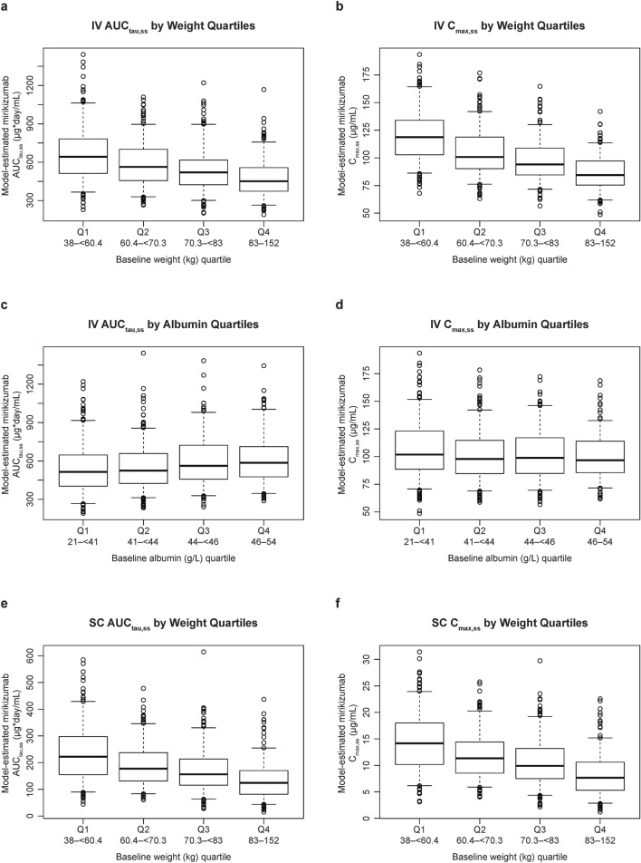 Results: Mirikizumab pharmacokinetics was best described by a linear two-compartment model with first-order absorption. Clearance, volume of distribution for central and peripheral compartments, and half-life were estimated at approximately 0.022 L/h (linear), 3.11 L and 1.69 L, and 9.5 days, respectively. Statistically significant effects of body weight and serum albumin levels on clearance, body weight on central and peripheral volumes of distribution, and body mass index on bioavailability were observed but effects were small relative to random inter-individual variability (% coefficient of variation: 18-64%). The subcutaneous bioavailability of mirikizumab was 48%.