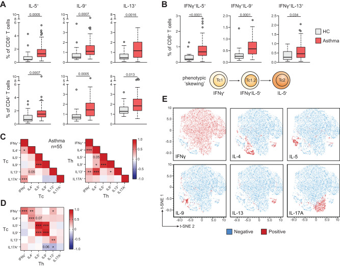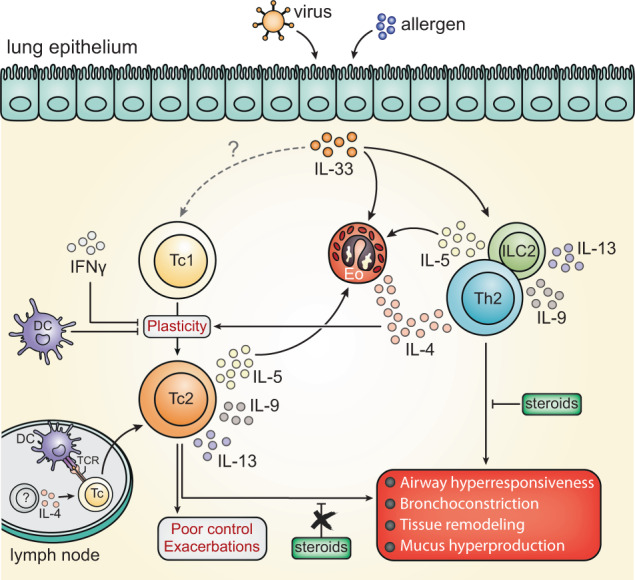 CD4+ T helper 2 (Th2) cells and group 2 innate lymphoid cells are considered the main producers of type-2 cytokines that fuel chronic airway inflammation in allergic asthma. However, CD8+ cytotoxic T (Tc) cells - critical for anti-viral defense - can also produce type-2 cytokines (referred to as 'Tc2' cells). The role of Tc cells in asthma and virus-induced disease exacerbations remains poorly understood, including which micro-environmental signals and cell types promote Tc2 cell formation. Here we show increased circulating Tc2 cell abundance in severe asthma patients, reaching peak levels during exacerbations and likely emerging from canonical IFNγ+ Tc cells through plasticity. Tc2 cell abundance is associated with increased disease burden, higher exacerbations rates and steroid insensitivity. Mouse models of asthma recapitulate the human disease by showing extensive type-2 skewing of lung Tc cells, which is controlled by conventional type-1 dendritic cells and IFNγ. Importantly, we demonstrate that the alarmin interleukin-33 (IL-33) critically promotes type-2 cytokine production by lung Tc cells in experimental allergic airway inflammation. Our data identify Tc cells as major producers of type-2 cytokines in severe asthma and during exacerbations that are remarkably sensitive to alterations in their inflammatory tissue micro-environment, with IL-33 emerging as an important regulator of Tc2 formation.